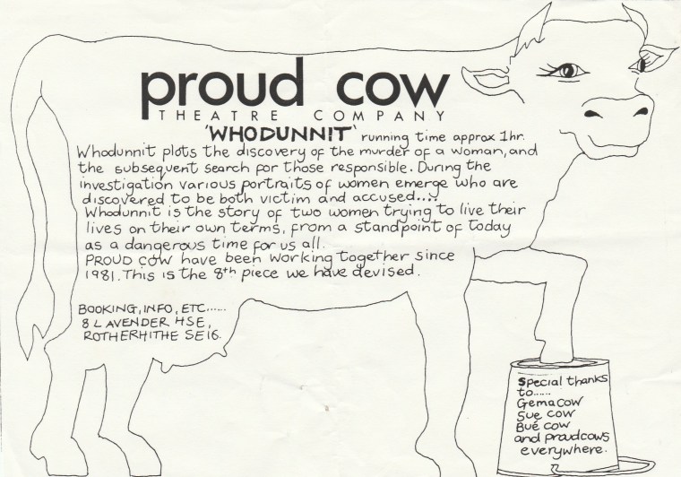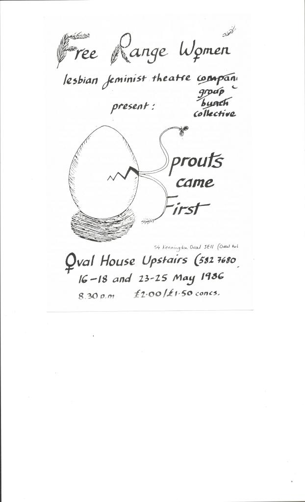Another important venue was the Oval House, in Kennington, which Kate Crutchley ran in the 80s. Lots of the plays of these groups were put on there, including our play Sprouts Came First. Kate was one of my mentors, was incredibly supportive to the development of dyke theatre. It’s also worth mentioning the GLC (Greater London Council) here because they also offered a lot of resources to the community to express ourselves culturally. Also the Arts Council.