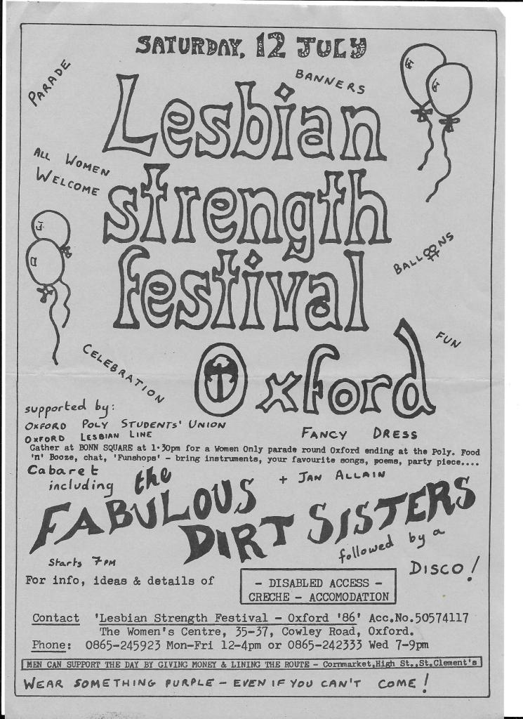Lesbian Strength marches often included a cabaret and disco afterwards – I was involved in organising (and performing in) some of the cabarets in London, and Free Range Women performed after the Oxford Lesbian Strength march in 1986.