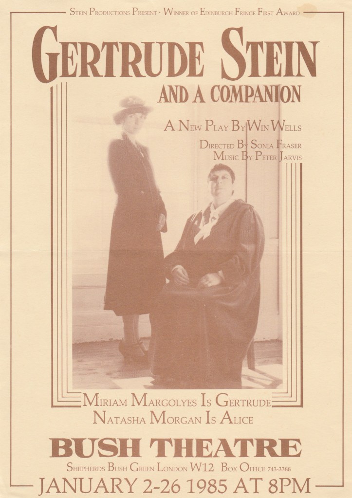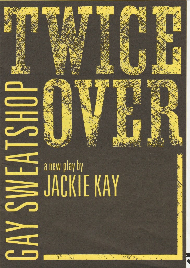 Lesbian theatre groups abounded. A lesbian feminist play could be a play that was written by a lesbian or about lesbians or preferably both, preferably also acted by lesbians, with themes around coming out such as Any Woman Can from 1976, which in its first one-night performance in Leicester starred Miriam Margolyles, seen in this slide in another play, Gertrude Stein and a Companion – and Jackie Kay’s Twice Over at the Drill Hall in 1988.